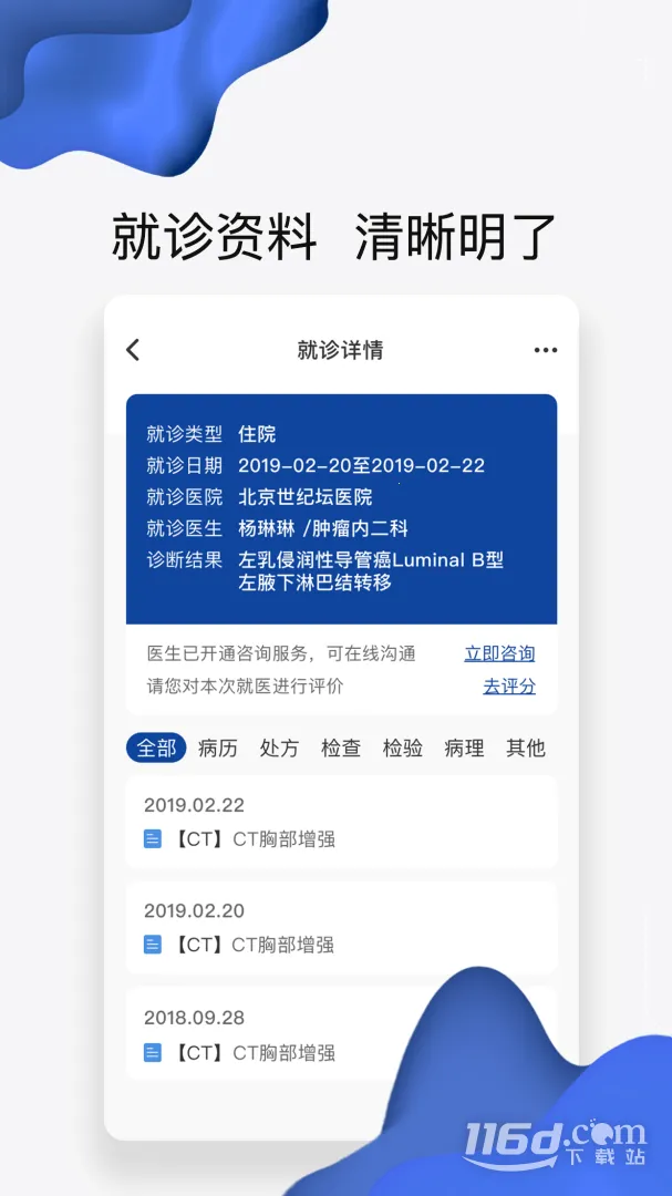 4. 通过 APP 能方便快捷查询门诊就诊处方、住院信息中的出院小结、诊断证明书等病历资料,以及各种检查检验结果和报告。