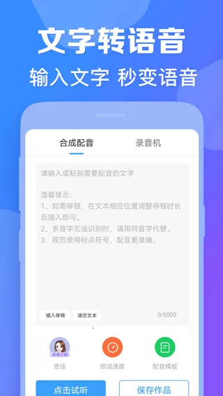 软件特色也很突出,能随意添加个性化背景音提升作品质感,依托百度智能语音技术语音自然流畅,可轻松拷贝音频文件到U盘或内存卡,还能连上蓝牙音箱随时享受好声音。总之,是一款非常值得拥有的配音软件。