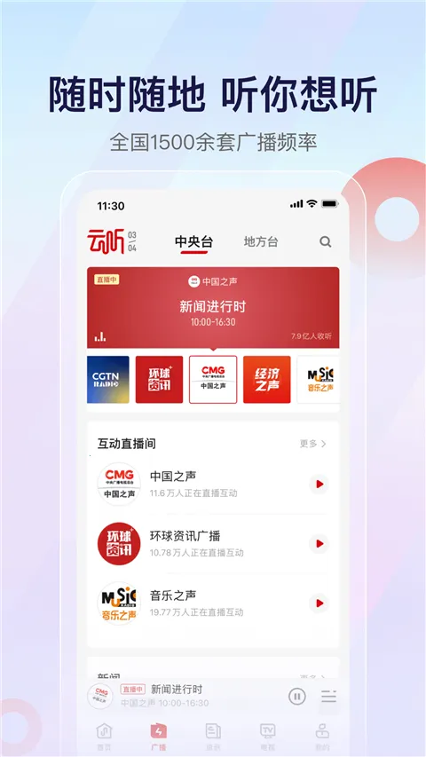中央人民广播电台云听2026官方正版是重点打造的广播音频软件,资源丰富,涵盖英语、健康等多种类型,有轻大学、头部精品等功能,能精准推荐海量内容,支持明星主播互动,连接智能设备,带来优质收听体验。