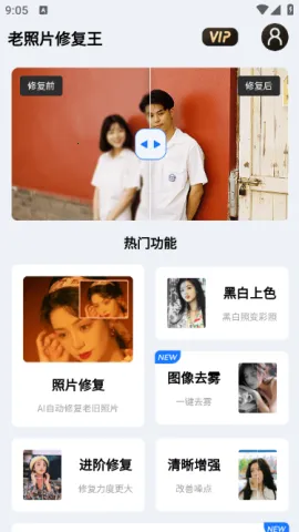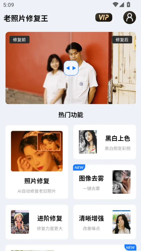 智能老照片修复王最新手机版是专为怀旧人群打造的照片复兴工具。用先进AI技术,能自动修复瑕疵。内置丰富修图工具,操作流畅。可一键修复多张照片,随时预览效果,还能黑白上色、无损放大等,让旧照重焕生机。