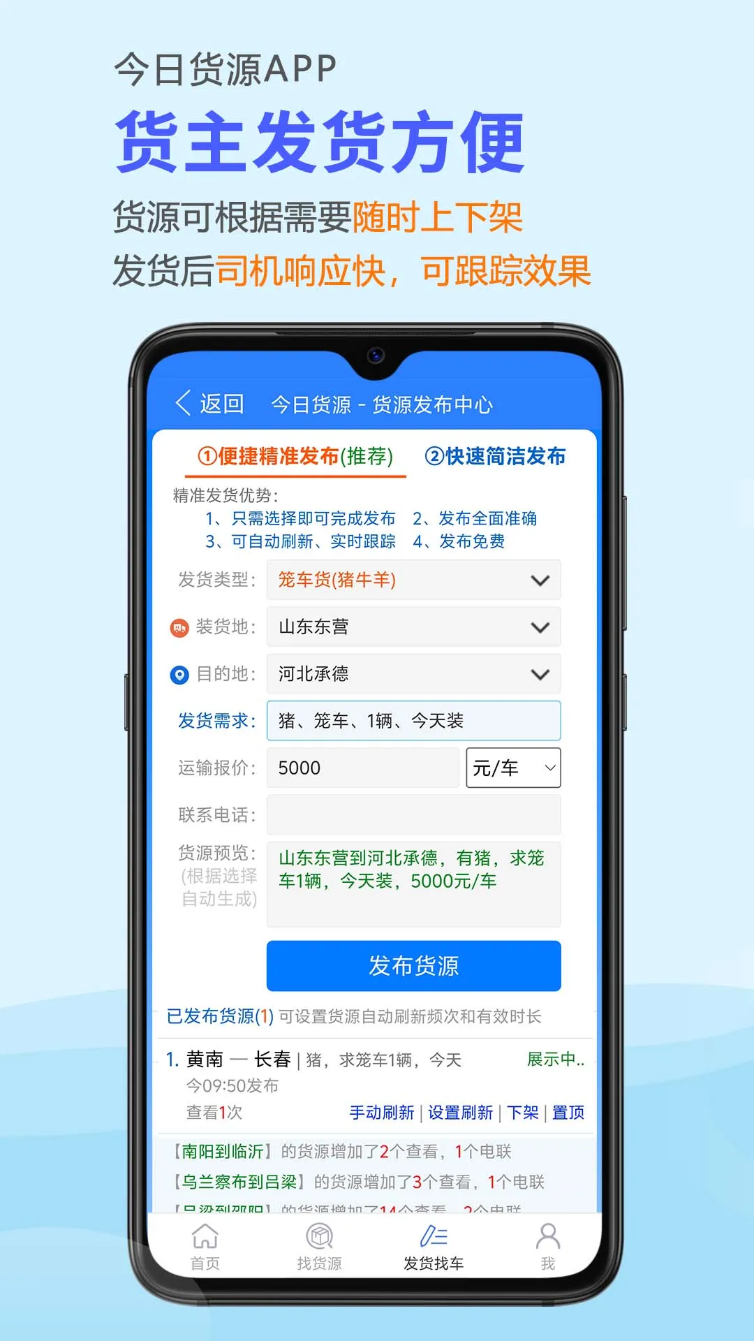 2. 精准找货:依据起始地、目的地和车型车长,即可精准找到合适货源,还提供联系电话,能直接电话交流,查看运输路线、服务地址等信息。