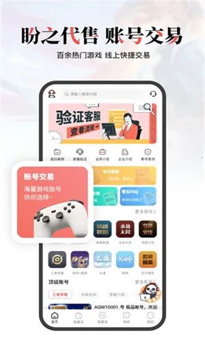 盼之代售交易平台特色显著。它涵盖百余热门游戏,能高效快捷地进行线上交易,提供靠谱的游戏账号交易服务渠道。坚持从专业层面为客户解决游戏估值问题,已有百万用户,涉及游戏种类繁多。拥有专业线下团队,可帮用户找回账号,还有专业担保团队提供防找回服务。买卖双方交易前会提前进行安全审核检测,默认收取卖家身份信息并验证真假,在账户交易方面口碑良好,为客户营造了安全的交易环境。