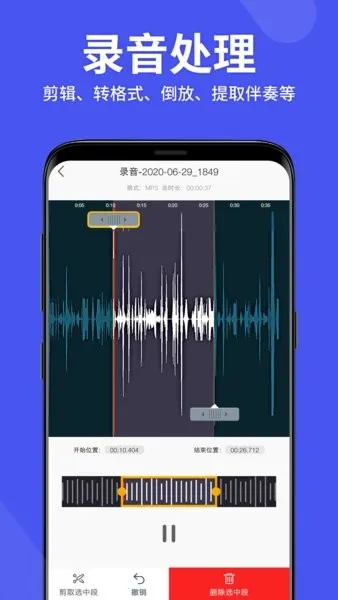 它功能丰富,录音时单击钉按钮可附上标签;音频能上传云端存储,不占手机空间还不会丢失;误删的音频可在回收站找回;支持录音剪辑,能轻松选理想部分操作,还能剪去或删除选中部分;播放支持倍速、顺序及循环播放,格式也能任意转换。