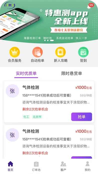 1. 在线抢单便捷:海量检测订单随时可抢,系统自动抢单,清晰方便,助您轻松获取订单。