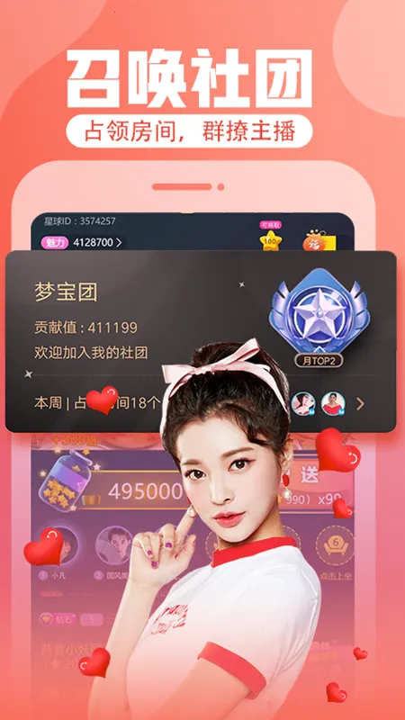 2. 趣味游戏互动多样,边看边玩趣味无限,还有全新社团占领主播房间、主播PK、幸运刷刷乐等甜蜜互动。