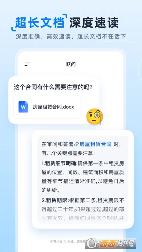 跃问特色鲜明。它能智能全方位问答,不管是文字、图片还是语音提问,都能迅速响应,全网搜索给出准确答案。创新的拍照识图技术超厉害,一拍即识,拓展知识边界。作为高效文档理解专家,能快速阅读长篇文档并提炼关键信息。多端无缝同步,APP 与网页版数据实时同步。还适用于多场景,提供个性化服务,从个人到企业,从学习到创新,满足多元化需求,是您身边超实用的智能助手。
