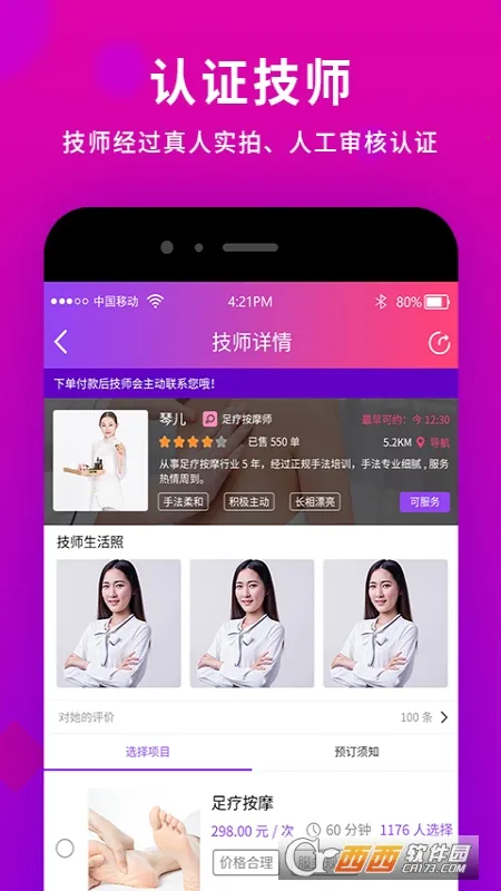 闲选按摩是一款超棒的上门按摩服务平台。它功能全面,能解决咱们不少实际需求。不管是居家想放松,还是出差旅行想缓解疲劳,又或是有健康养生需求,它都能满足。这里技师资源丰富,你能通过它随时随地查看附近技师的照片、自我介绍、用户评价及距离等信息,然后一键预约心仪技师上门服务,不用出门就能享受专业按摩。平台服务项目丰富,有中医养生、足疗保健、美容美体、全身SPA、小儿推拿等多种绿色理疗服务。而且所有技师都经过实名认证,技术专业、服务可靠。它已开通全国130余个城市,覆盖范围广。下单也便捷,APP和公众号都能预约。价格透明,全程不加价,还有平台保障交易,资金和人身安全都能得到保障。要是你正在找专业安全便捷的上门按摩服务软件,闲选按摩绝对值得一试,快来下载体验吧!