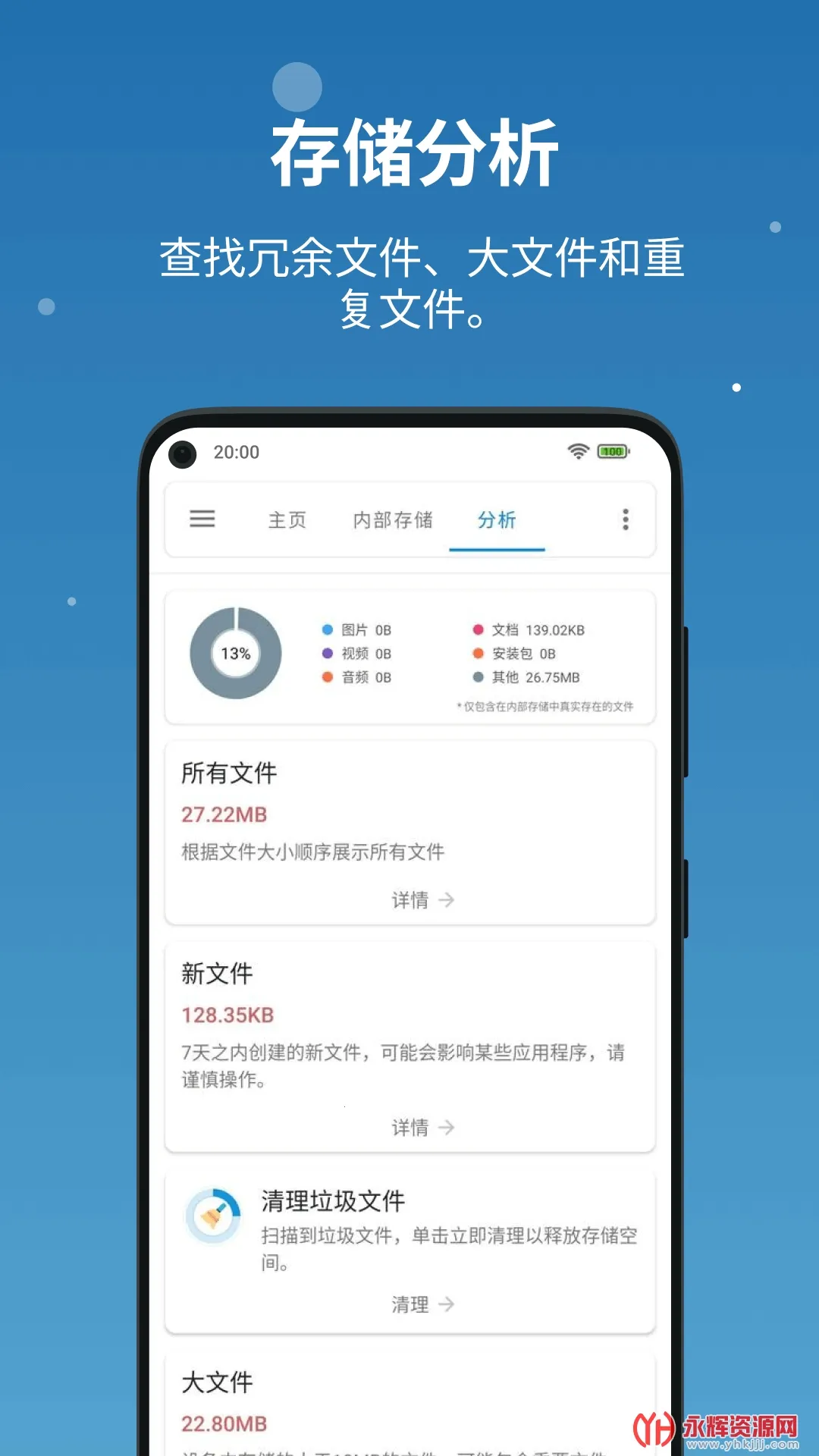 2.存储分析功能,可以帮助你查看手机里面什么文件在占用空间,方便你清理删除一些没用的文件