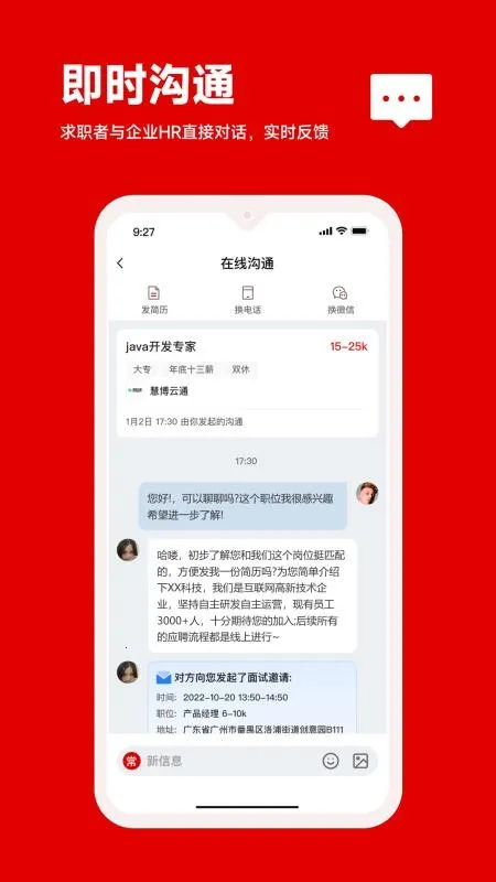 3. 高效对接供需:助力求职与招聘双方随时在线快速对接需求,企业HR能高效招聘,求职者可轻松求职。