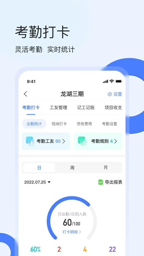 使用它很方便。多维度考勤统计,自动生成工时、迟到早退、缺勤等详细报表,数据可视化,让管理决策更精准。还能对接薪资核算,考勤数据一键同步至工资系统,自动算工时工资,减少人工核算错误和纠纷。支持项目分组管理,按工地、班组、工种等多层级架构设置,适配各类工程项目需求。