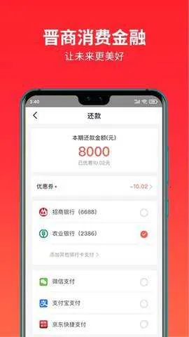 晋商消费金融为用户提供了便捷的借款服务。其额度灵活,依用户信用和借款记录定制,最高可授信200000元,且无担保抵押。审批放款速度快,能让急需资金的用户迅速获得支持。还款方式多样,可随用随取、按日计息,无提前还款手续费,还有系统自动还款提醒,避免逾期。借款流程透明,费用清晰,保障用户知情权。注重信息安全隐私,采取严格加密等措施。致力于提升用户体验,不断优化服务功能。不过,部分用户反馈其利率在同类产品中不算低。总体而言,它能满足不少用户的借款需求,但用户在使用时也需综合考虑自身情况和成本。