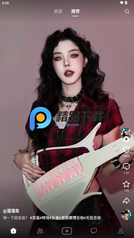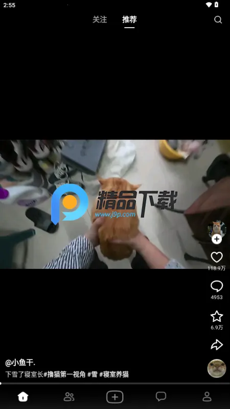 3、操作易上手:基本功能和抖音类似,上划可更换视频,发布短视频点击中间加号导入即可。