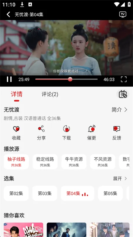 1. 每个节目提供多个片源,可根据用户所在地的播放流畅度自由选择,让您总能找到最适合自己的播放源,享受流畅观影体验。