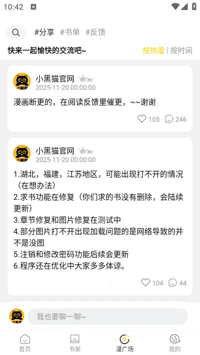 小黑猫漫画真的是一款超棒的漫画软件!它的资源丰富得让人惊叹,国漫、日漫、韩漫、美漫等应有尽有,不管是新漫画还是老漫画,都能轻松找到。每日更新推送,总能让我第一时间看到最新鲜的内容。而且它能根据我的阅读偏好精准匹配,每次打开都像挖到宝一样,总能发现感兴趣的新漫画。支持下载后无网也能看,这一点太贴心了,坐地铁、等人的时候都能尽情沉浸在漫画世界。阅读模式多样,夜间模式自动调整亮度,眼睛舒服极了,再也不用担心看漫画伤眼啦。在互动社区里还能和其他漫友讨论剧情,交流心得,这种氛围太棒了!强烈推荐给所有爱漫画的小伙伴,小黑猫漫画绝对能满足你对漫画阅读的所有期待!