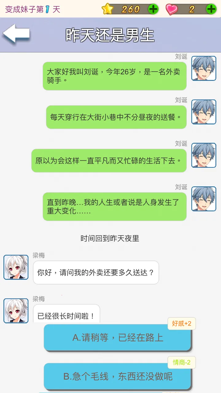 《我变成了妹子2025》是一款融合侦探推理、变性解谜元素的冒险解谜文字手游。外卖员变身妹子,在陌生环境中探索真相。日系动漫风,多线结局,通过点击收集线索推理,还有自制漫画等玩法,快来下载体验。
