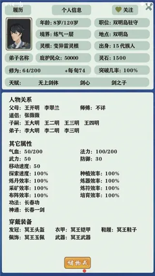 修仙家族模拟器破解版具有丰富特色。**独特修仙背景**:凡人流设定,境界多元,从炼气到化神再飞升灵界,地理环境如乱星海般独特,凡人与修士混居,以家族和宗门主导势力管理岛屿。**家族血脉传承**:创建家族时可选择特色血脉传承,自身携带能力,家族后人有机会出现,血脉种类多样。**十八代族谱设定**:创建家族时排出十八代辈分,体验家族成长全过程。**丰富人物关系**:涵盖父母、道侣、弟子等多种关系,高度还原修真世界人情。还有岛屿争霸、修真百艺等玩法,地图随机生成,每次体验都充满未知与惊喜。