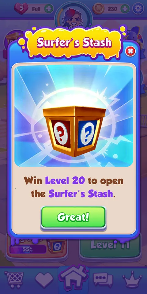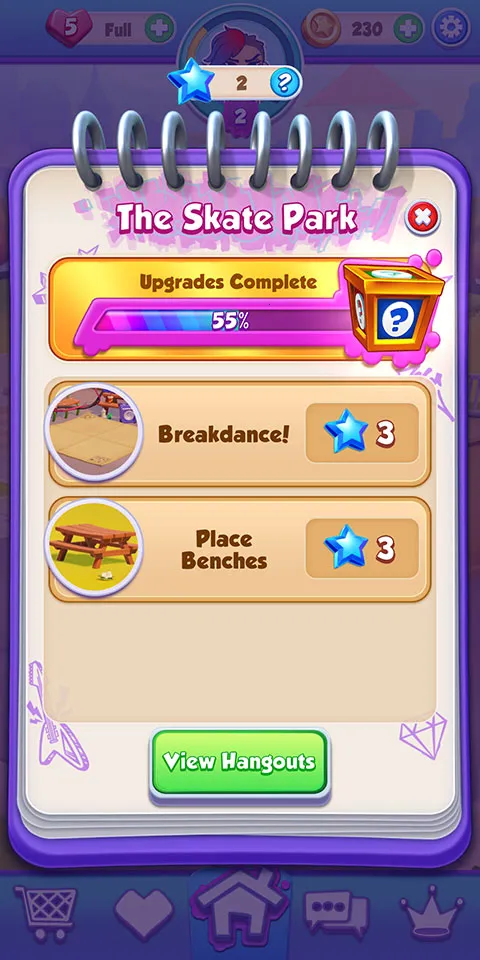 这款游戏给人带来了丰富多样的趣味体验。游戏画面色彩绚丽,场景丰富,从单调的休息室到充满活力的滑板天堂,每个场景都独具特色。玩法上,经典的三消玩法简单易上手,通过排列相同颜色方块消除来完成关卡挑战,过程紧张刺激。而且,玩家能不断解锁新角色和特殊道具,助力闯关,增添了不少策略性。收集星星装饰场景也很有意思,让玩家有了更多的目标和动力。无论是与朋友组队提升排名,还是离线独自畅玩,都能在消除方块的过程中尽享乐趣。每一次升级场景的变化,以及新关卡的不断加入,都让游戏保持着新鲜感,让人沉浸其中,难以自拔。
