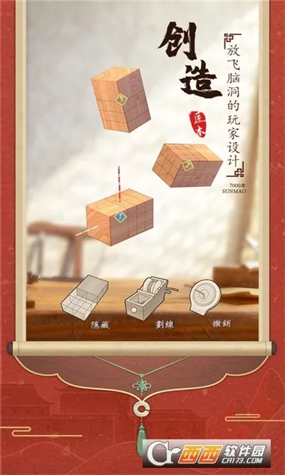 《匠木2025官方正版》有着诸多特色。它以榫卯题材为主进行空间解谜,玩家通过观察图纸想象结构,经点击消除等操作打磨零件拼合指定榫卯结构解开谜题,带来严丝合缝的空间挑战。其切磋板块提供社区空间,能让玩家发挥想象力设计关卡供他人挑战或体验他人脑洞,做到寓教于乐、学以致用。馆藏板块收集主线关卡榫卯物件图纸,以类AR视觉效果360度呈现组合原理,科普榫卯历史文化,让玩家感受千年木作结构美学,领略国粹经典魅力。