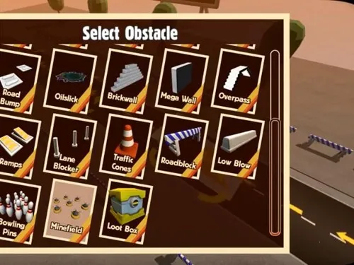 车祸英雄中障碍物的种类有15种,玩家可以根据自己的需要和喜好进行选择,只有合理地放置障碍物的位置,才会得到更高的分数。比如在下图中,在车量多的公路路口处,小编放置的是机油,这样放置可以让车子在路口处让车子打滑,使车子更容易进入进入该公路路段,从而与其他来往车辆相撞,得到高分。另外,在某些特殊的场景中,玩家要是能运用好加速、跳板和地雷等障碍物,可以在特定情况下起到意想不到的效果。
