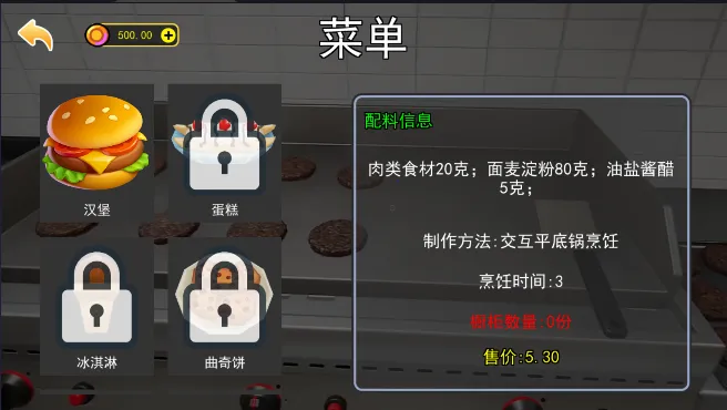 汉堡店打工模拟是一款经营游戏,玩家在汉堡店沉浸式体验一天。按顾客需求制作汉堡,从选食材到烹饪全程亲力亲为。通过时间管理模式完成订单,赚取收益升级设备解锁菜谱,还有成就系统激励闯关。