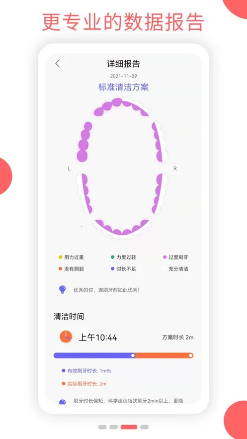 1. 智能分析,生成报告:运用智能硬件、云计算和大数据平台,综合分析用户刷牙路径、清洁盲区等数据,生成连续性的刷牙健康报告。