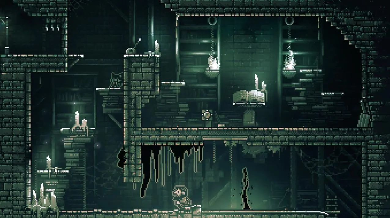 极渊是一款剧情向像素风解谜冒险生存游戏,玩家将体验三个主角视角,在不同场景探索,切换视角推进剧情,操作角色跳跃躲避陷阱,利用武器消灭怪物,揭开废弃古堡真相。