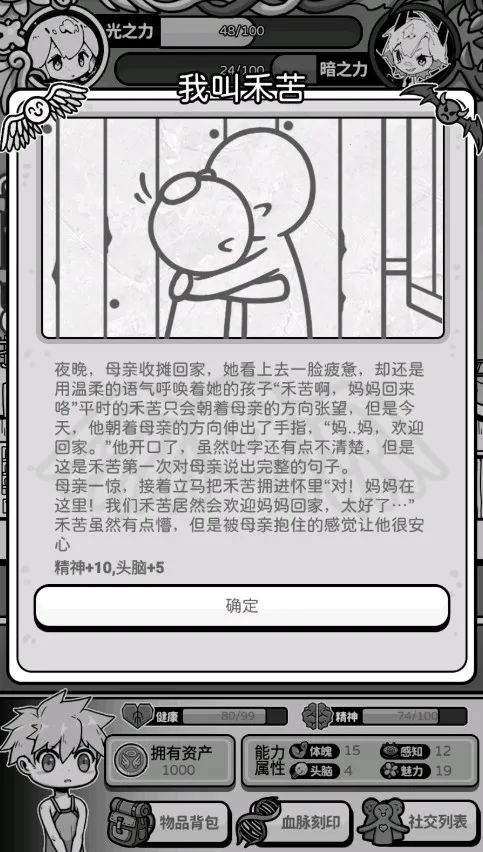 画面采用黑白动漫画风,人物形象随年龄增长而变化。整体而言,它是一款玩法新颖、内容丰富,能让玩家沉浸其中体验天使庇护他人人生的策略养成佳作。