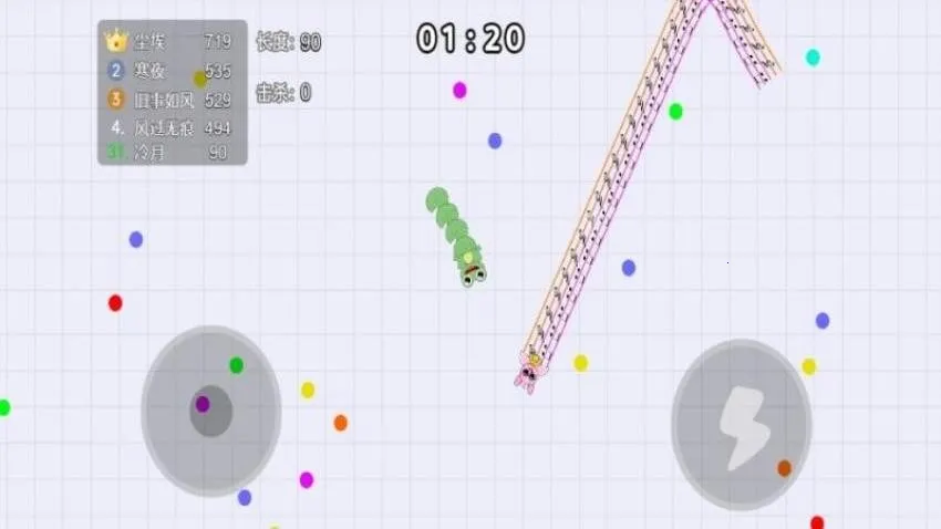 4、控制角色在游戏不断吃掉食物,需要远离身体比自己长的怪物,碰撞就会被击杀