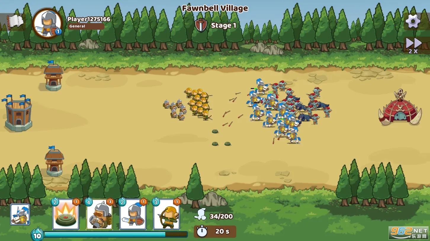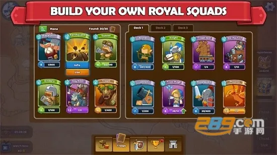 2、设有丰富关卡副本,可提升兵种实力,搭配不同卡组构建多变战术,在卡通风格的宏大战场夺取胜利,建立强大王国。